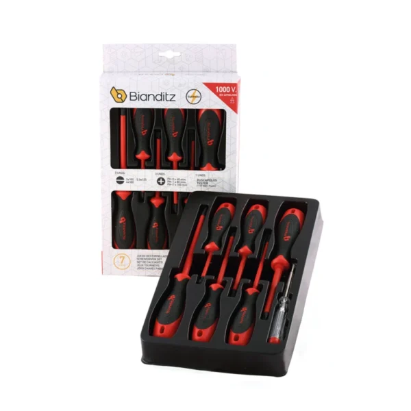 Tipo: Aislados. Los destornilladores de la serie Aislados están diseñados y fabricados para trabajos en tensión hasta 1.000V. Corriente alterna y 1.500V corriente continua. Homologados por VDE, cumplen con las normas más exigentes de calidad Europeas EN60900 IEC60900:2004 en cuanto a ensayos de choque, dieléctricos, de penetración, de adherencia, no propagación de llama y por supuesto ensayos mecánicos.